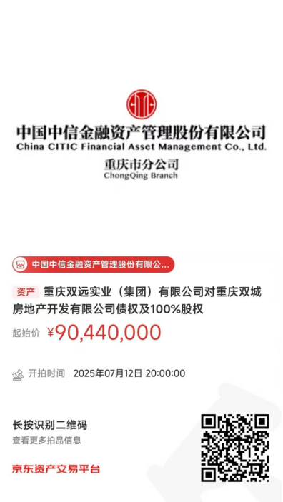 重慶雙遠實業(yè)(集團)有限公司持有重慶雙城房地產(chǎn)開發(fā)有限公司債權(quán)和100%股權(quán)。重慶雙遠實業(yè)(集團)有限公司將于2025年7月12日20時至2025年7月13日20時在京東拍賣網(wǎng)通過公開競價方式進行處置,拍賣鏈接如下圖所示,現(xiàn)予以公告。